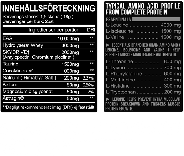 - 10g EAA (välttämättömiä aminohappoja) optimoimaan lihasten rakentamista ja palautumista.
